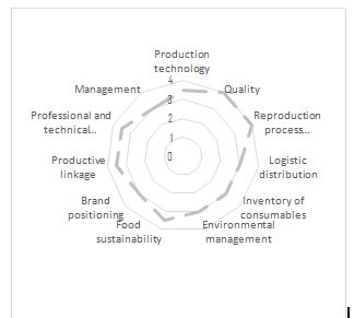 Organization C, as shown on Figures 5 and 6, has a very good performance in the following key factors: reproduction process management, purchasing logistics and inventories, consumables, environmental management and protection, food sustainability. It has a very critical performance in brand positioning and management, while its performance is acceptable in production technology, quality management system: (resolution 2640 ICA), logistic distribution, productive linkage, professional and technical training.