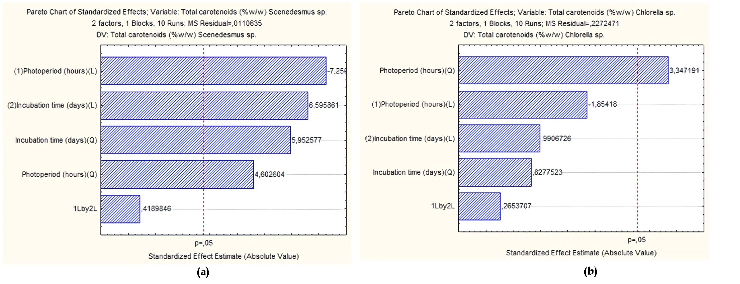 Figura 1 Diagrama de Pareto obtenido con base en el impacto de stress por radiación lumínica y efecto del tiempo en la deposición de carotenoides en (a) Scenedesmus sp. (b) Chlorella sp.