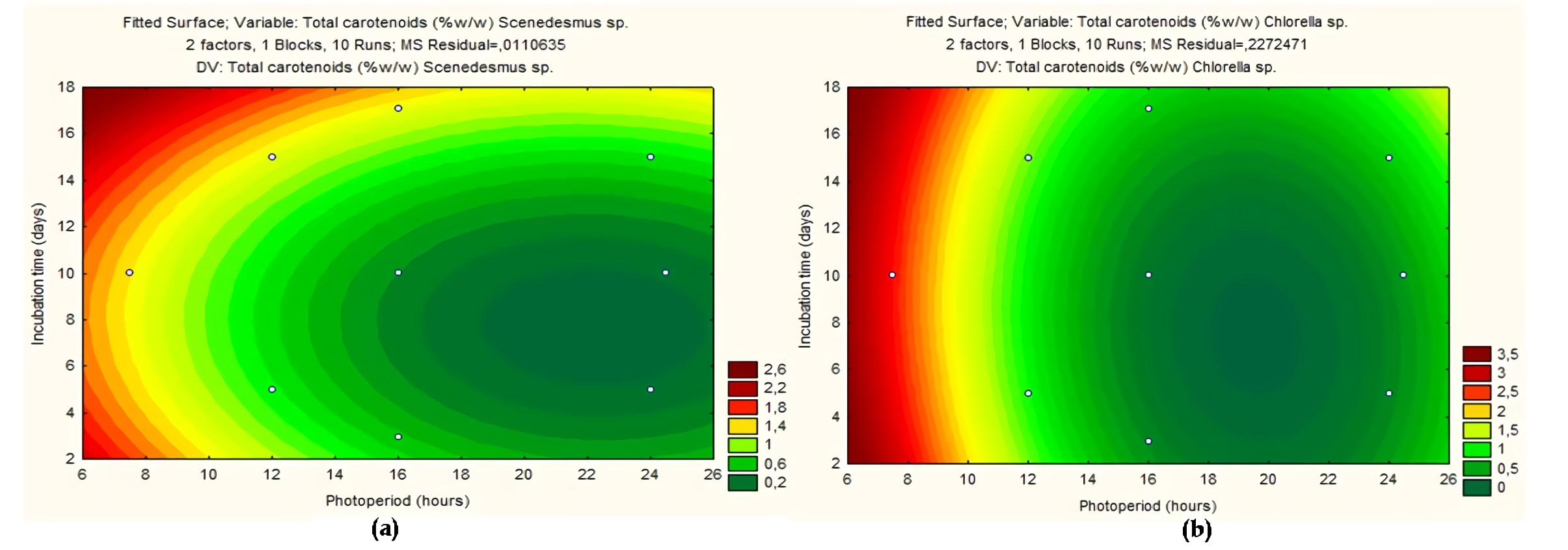 En Chlorella sp., el tiempo de incubación no influye (Figura 2) en la producción de carotenoides lo cual muestra que para optimizar las condiciones del mismo se puede inocular directamente el reactor desde caja o manejar tiempos de incubación cortos, con el fin de que las células se adapten al medio líquido y este se use como pre-inóculo del bioreactor, por tanto el óptimo del diseño da a conocer que hay mayor deposición de carotenoides bajo fotoperiodos cortos de luz, y desde parámetros de luz de 13 horas la producción de carotenoides es viable, pero por consiguiente aumenta a medida que disminuye el ciclo luz: oscuridad, es decir, entre menos cantidad de luz se exponga esta micro-alga mayor va hacer la producción de carotenoides, y un posible optimo seria bajo fotoperiodo 5:19 (luz : oscuridad).