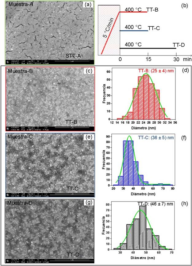 En la Figura 1 se observan las imágenes MEB de la superficie de las muestras, junto a un esquema ilustrativo de los diferentes tratamientos térmicos, así como las gráficas de la distribución del tamaño de grano correspondientes a cada una de las muestras tratadas térmicamente. La micrografía MEB para la muestra de referencia A, cobre sin tratamiento térmico (STT-A) (Figura 1a), exhibe una morfología homogénea con contornos oscuros que podrían ser grietas debido al proceso de evaporación térmica, en donde gotas del material en estado vapor se condensan y solidifican rápidamente sobre la superficie del sustrato, de acuerdo con un gradiente de temperatura que limita la cristalización y formación de fronteras de grano 25. Después de someter la muestra de cobre a los diferentes tratamientos térmicos (Figura 1b), se observa un cambio significativo de la microestructura, presentándose una transformación hacia nanoestructuras de tipo granular (Figuras 1c, e, g). A partir del número de cuentas de granos (representado como frecuencia) en función del diámetro, se construyó un histograma por cada tratamiento térmico sobre un total de 260 granos, distribuidos en 130 mediciones para imágenes con magnificación de 80kX y 130 para 120kX (Figuras 1d, f, h).