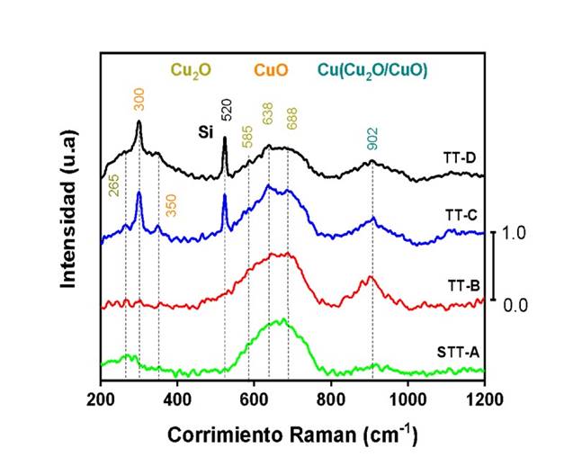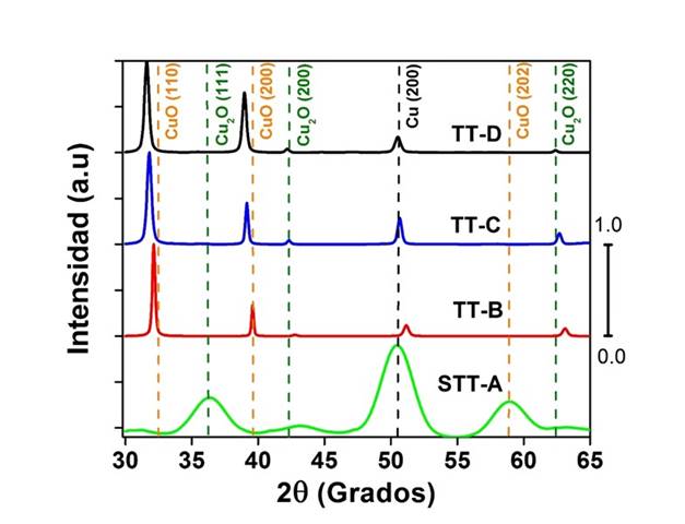 Al realizar un seguimiento a las intensidades de los picos, se observa que el pico asociado a la reflexión (110) de la fase CuO con estructura cristalina monoclínica, es el pico más intenso en todas las muestras tratadas térmicamente. Realizando una normalización a dicho valor, se encuentra que el segundo pico de mayor intensidad también pertenece a la fase CuO, la reflexión (200); siendo esta última de menor intensidad en la muestra TT-B y mostrando un incremento para las muestras (TT-C y TT-D). Las bajas intensidades de las reflexiones para los picos (200) y (220) de la fase Cu2O con estructura cubica, denotan que es una fase minoritaria de las nanoestructuras y muestra además que el tratamiento térmico con rampa de temperatura (TT-B), al presentar la menor intensidad, es el que promueve en menor medida la formación de los óxidos de cobre.
