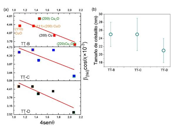 Lo anterior indica que un aumento en el tiempo del tratamiento térmico a 400°C promueve la orientación preferencial en dichas reflexiones, dando lugar a la formación de los óxidos de cobre, obteniendo un comportamiento similar a lo reportado por Choudhary y colaboradores 23, los cuales establecen que el mecanismo de oxidación para la formación de los óxidos de cobre inicia a una temperatura de 250°C para las fases de Cu2O y 320 °C para el CuO respectivamente. Por otro lado, los patrones de difracción para las muestras (TT-C y TT-D) presentan un corrimiento de los picos hacia la izquierda, con respecto a la muestra (TT-B), siendo este comportamiento asociado a la presencia de microdeformaciones de carácter compresivo de magnitud comparable en todas las muestras (lo cual ha sido verificado mediante los ajustes obtenidos con el método Williamson-Hall (W-H) 27; que conllevan a cambios volumétricos en la red cristalina y surgen debido a reacciones químicas que involucran la absorción de oxígeno y difusión de cobre durante la formación de los óxidos 28-30.