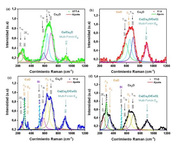 La Figura 4 muestra los espectros de dispersión Raman en un rango de frecuencias entre 200-1200 cm-1, para cada una de las muestras de estudio. Comenzando con el material de referencia, muestra STT-A, se detecta una banda ancha en el rango 550-780 cm-1, la cual refleja una superposición de diferentes modos asociados a la presencia de óxidos de bajo orden cristalino. En cuanto a la muestra TT-B, se exhibe una mayor intensidad, lo cual puede atribuirse a un incremento paulatino de la presencia de óxidos, a causa del tratamiento térmico aplicado. Así mismo se detecta un pico adicional centrado alrededor de 902 cm-1 que, de acuerdo con la literatura 35, puede ser asociado a modos Raman de origen superficial activados, debido a la presencia de interfases tipo Cu/Cu2O y/o Cu/CuO en la muestra. El espectro correspondiente a la muestra TT-C presenta adicionalmente tres modos Raman en el rango 220-360 cm-1, siendo un primer pico centrado en 265 cm-1 asociado al modo multi-fonón 2Eu de la fase Cu2O 36, un segundo pico centrado en 300 cm-1 relacionado al modo Ag de la fase CuO y un tercer pico en 350 cm-1 correspondiente al modo Bg del CuO. Finalmente, la muestra TT-D, aunque presenta un espectro similar al de la muestra TT-C, se pueden observar ciertas diferencias en las intensidades de los picos en los rangos 220-360 cm-1 y 550-780 cm-1. Con el objetivo de dilucidar las diferencias en las intensidades, se realiza el proceso de deconvolución para cada uno de los picos encontrados y de las bandas en mención.