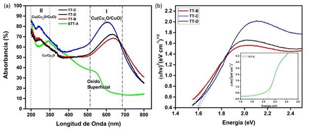 Luego de verificar la presencia de los óxidos de cobre por las técnicas de DRX y Raman, se llevaron a cabo ensayos de espectroscopia ultravioleta visible (UV-VIS), para determinar la banda prohibida y observar la influencia del tratamiento térmico en la absorbancia de las muestras. En la Figura 6a, se aprecian los espectros de absorción en función de la longitud de onda para cada una de las muestras de estudio. En primera instancia para la muestra de referencia (STT-A), se identifica un comportamiento monótono de los valores de absorbancia en el rango de 800 - 600 nm; para valores de longitudes de onda comprendidas entre los 600-500 nm se observa un primer incremento significativo logrando un valor del 37% de absorbancia; dicho comportamiento se atribuye a la presencia de la fase CuO de carácter amorfo formada durante el proceso de evaporación térmica 25 (evidenciada en el difractograma de rayos-X). Así mismo, se evidencia un segundo pico centrado alrededor de 290 nm con un porcentaje de absorbancia del 60% asociado a la coexistencia de las fases de Cu y Cu2O. Tal como se evidencia en la Figura 6a, la respuesta óptica para el caso de las muestras tratadas térmicamente cambia considerablemente para las longitudes de onda en el rango del visible; en específico se observa un pico característico en el rango 500 - 700 nm que evidencia un importante incremento en la absorbancia, el cual se atribuye a una mayor presencia de óxidos de cobre con fase ordenada, efecto directo de los tratamientos térmicos aplicados.