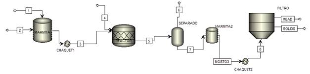 El proceso productivo de hidromiel a partir de miel de abejas se basó en una plata piloto con capacidad de 80 L ubicada en el municipio de San Mateo, Boyacá. La Figura 2 muestra el diagrama de bloques. El proceso cuenta con una etapa inicial (marmita) donde se adiciona miel (flujo 1) y agua (flujo 2) para formar el mosto. En esta etapa se calienta la mezcla hasta los 60 °C durante 20 min con el fin de disminuir la carga microbiana proveniente de las materias primas. El equipo posee una chaqueta de enfriamiento, la cual adecúa la temperatura del mosto a 17 °C, para luego pasar a la segunda etapa que es la fermentación. En esta etapa, ingresa el mosto (flujo 3) y se le adiciona 0.02 kg de levadura (flujo 4), obteniendo como resultado la corriente de producto general (flujo 5). Seguido de la etapa de fermentación, se hace circular el flujo 5 a un separador donde se retira el dióxido de carbono, la corriente resultante (flujo 7) se calienta en una marmita a 55 °C y mediante la chaqueta se reduce la temperatura a 17°C. Finalmente se ingresa la corriente 8 a un filtro donde se realiza el trasiego para retirar los sólidos presentes y se obtiene el producto principal (flujo 10).