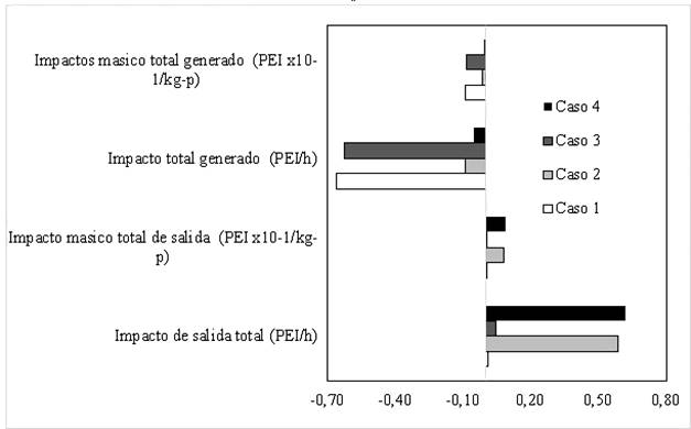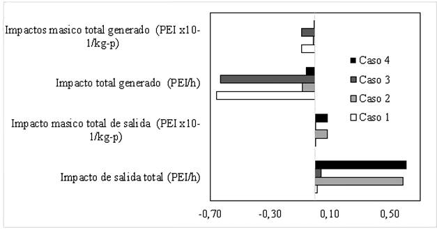 En la Figura 3 se pudo identificar que los impactos generados dentro de la planta, por unidad de tiempo y masa para los cuatro 4 casos son negativos, ya que el proceso dentro de sí mismo no generó daños ambientales debido a la naturaleza orgánica de las materias primas que se procesan (miel, polen, levadura, agua). Cuando se tiene en cuenta el caso 2, el PEI/kg-P es de 8.1 x 10-2, valor que estuvo por encima del caso 1 debido a la presencia de etanol y dióxido de carbono, este último, contribuye al aumento de la huella de carbono 11. Respecto a los PEI de salida por unidad de masa, se puedo concluir que en general los daños ocasionados al ambiente son mínimos, comparados con procesos como la Producción de Bioetanol Carburante, el cual posee unos impactos totales de salida de 0.311-0.404 PEI/kg-p cuando se utiliza maíz y caña de azúcar como materia prima12; en el proceso de producción de hidromiel los máximos valores alcanzados se atribuyen al caso 2 (8.10 x 10-2 PEI/kg-P) y caso 4 (8.39 x 10-2 PEI/kg-P) en los cuales se tienen en cuenta la corriente de producto.