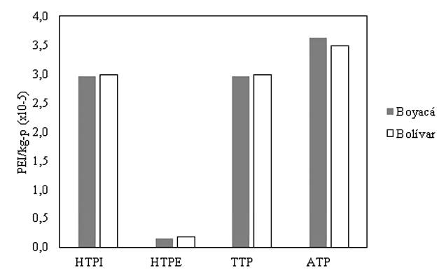 En la Figura 6, se compararon los impactos toxicológicos por unidad de masa generados en las plantas de estudios, donde se tuvo en cuenta la influencia de la energía asociada a los procesos. Se analizó, que la diferencia energética de 7.05 MJ/h a favor de Boyacá, tuvo mayor impacto en la categoría ATP la cual depende del LC50, relacionado con la combustión de la fuente de energía y la producción de vinazas, subproducto generado en la fermentación con alto contenido orgánico capaz de alterar los cuerpos de agua, colocando en riesgo la vida acuática16. Los impactos HTPI, HTPE y TTP dependen del flujo de materia prima que cruza los límites del sistema.