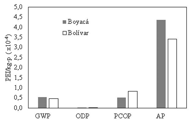 En la Figura 5, se observó que la planta de Boyacá generó un mayor impacto ambiental, debido a la diferencia a favor en el consumo energético entre Boyacá (31.79% MJ/h) y Bolívar (24.74 MJ/h). La temperatura ambiente de la región de San Manteo, que en promedio es 17°C13, hace que se eleve el requerimiento energético de gas natural para calentar y por ende se producen en mayor cantidad de contaminantes que facilitan la formación de lluvias acidas y calentamiento global14,15).