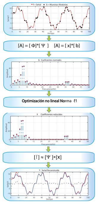 Esta metodología se basa en el tratamiento digital de señales, se inicia con la adquisición de una señal discreta la cual es almacenada en un vector [ ¦ ] para el presente ejemplo el vector [ ¦ ] es un vector fila de longitud m = (1x4000), esta señal es trasformada del dominio del tiempo al dominio de la frecuencia para extraer los coeficientes de la misma, por medio de una matriz denominada diccionario [ Y ]. La matriz diccionario [ Y ] o matriz subyacente puede ser modelada a partir de la trasformada rápida de Fourier (FFT), transformada Wavelet (DWT), transformada discreta del coseno (DCT), en sí cualquier trasformación lineal que lleve la señal sensada al dominio de la frecuencia, donde la señal se transforma en un vector de coeficientes [C], para el presente caso de estudio se usa como matriz diccionario [ Y ] la transformada del coseno (DCT), porque sus coeficientes son de tipo real 23-25.
