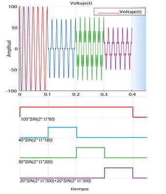 De t=0.2 segundos a t= 0.3 segundos la señal fundamental se contamina con una señal de quinto armónico de amplitud 100 (V) pico-pico y frecuencia de 300 (Hz).