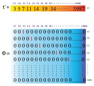 La matriz [F] conocida como matriz de mediciones para el caso en estudio es una matriz de 400 filas por 4000 columnas, esto implica que tiene 400 vectores fila de longitud igual a 4000, cada vector fila de la matriz [ F ] tiene 3999 ceros y un 1 que corresponde donde se tomó la muestra de medición esto se expresa en la Figura 4.