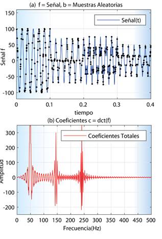 El vector [b] es un vector con (1/10) de muestras aleatorias de la señal ¦, por lo que la matriz de mediciones [Φ] es un subconjunto de las filas del operador identidad. En la Figura 5a se aprecia la señal de [¦ ] en el dominio del tiempo en forma de puntos, en la Figura 5b se observa los coeficientes de la señal en el dominio de la frecuencia.