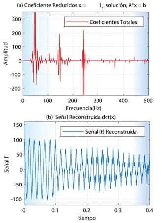 En la Figura 6 se puede observar la reconstrucción de las señales y los coeficientes del vector [x]. Este es un problema de optimización convexa que de forma práctica se reduce a un programa lineal conocido como seguimiento de bases, una vez encontrado el vector de mediciones [x] se puede reconstruir la señal mediante la Ec.13: