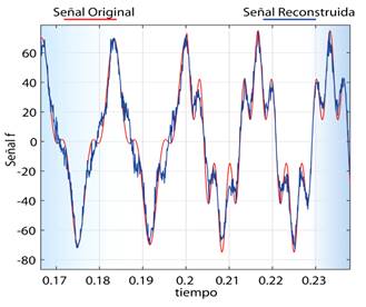 De los problemas analizados en las diferentes técnicas de localización de distorsión armónicas en redes eléctricas, los más recurrentes son: los recursos computacionales, tiempo de procesamiento, ruido superpuesto en la señal y resolución de tiempo frecuencia de la señal. Todos estos problemas son superables con la técnica de sensado comprimido, es por esto que se propone esta técnica para la localización de distorsiones armónicas 1,37. En la Figura 7 se puede apreciar la comparación entre la señal original y la señal comprimida que se reconstruyó.
