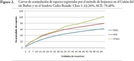 La diversidad de especies arrojada por el índice de Shannon-Wiener fue mayor en el SCR (H=4,54) que en el CRB (H=3,87). La similitud en la composición de especies de ambos bosques fue baja según los índices de Sorensen-cuantitativo (0,1073) y Jaccard (0,082). El SCR y CRB no presentaron diferencias significativas en cuanto a la riqueza (U=-1,22, p=0,21) y abundancia de especies (U=-0,835, p=0,403). Las abundancias registradas por los métodos de hojarasca y necrotrampa presentaron diferencias significativas (U=4,67, p=0,000). Esta diferenciación coincide con los resultados obtenidos al evaluar la eficacia de los métodos de colecta usados, donde se obtuvo un esfuerzo de muestreo de 72,5 % (Chao 1) y 76,3 % (ACE) para las necrotrampas (Figura 1); mientras que para hojarasca los valores de Chao 1 y ACE fueron 63,26 % y 79,48 %, respectivamente (Figura 2).