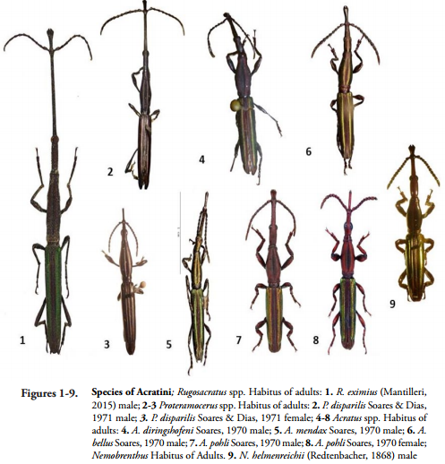 Acratus is considered a genus between the Ithystenini and the Nemocephalini (SOARES, 1970); it differs from slender Proteramocerus and Teramocerus by the sturdy body (except Acratus apicalis); the head and rostrum are shorter than either Proteramocerus or Teramocerus; the prothorax is pyriform or cylindrical, sulcate; the elytral apex is rounded; the first tarsal segment is almost as long as the length of 2nd and 3rd together.