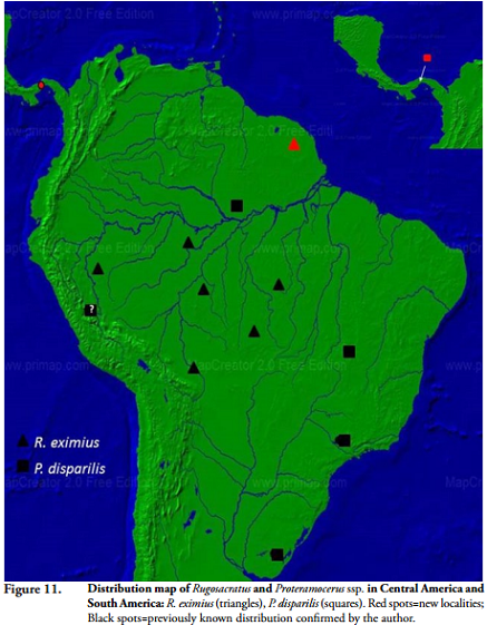 Remarks: according SOARES & DIAS (1971), P. disparilis belongs to a Proteramocerus restricted group without elytral thorn-shaped caudal appendices, taxonomically close to Proteramocerus fidus (KLEINE, 1927). The distribution from Peru (Paratype) cited by SOARES & DIAS isn't mentioned by SFORZI & BARTOLOZZI (2004), but is very doubtful. See remarks on the map [Fig. 12. Squares (?)] Rugosacratus Mantilleri, 2015