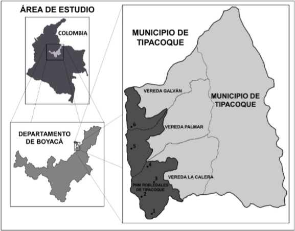 El Parque Natural Municipal Robledales de Tipacoque (PNMRT) se encuentra ubicado al norte del departamento de Boyacá, en el sector rural del municipio de Tipacoque (figura 1). El PNMRT hace parte del corredor Guantiva-La Rusia-Iguaque, limita al norte con el municipio de Covarachía, al occidente con Onzaga (Santander), al oriente con Boavita y al sur con Soatá (Fundación Natura Colombia, 2007; Gil-Novoa & Morales-Puentes, 2014, 2016; Martínez & Díaz, 2017; Martínez-O., Díaz-Pérez & Morales-Puentes, 2019; Vargas-Rojas & Morales-Puentes, 2014).