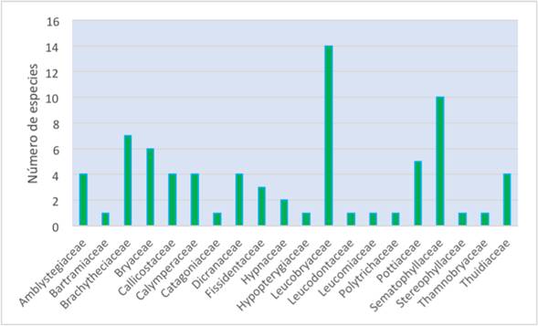 Las familias más diversas se encuentran representadas por Leucobryaceae (14 especies) con el 19 % de la diversidad total, seguida por Sematophyllaceae (10) con el 13 % y Brachytheciaceae (7) con el 9 % (figura 2). Los géneros más diversos fueron Campylopus con 13 especies (17.3 %) y Sematophyllum con seis (8 %).
