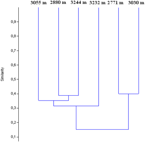 En cuanto a la similitud entre los transectos, los rangos altitudinales más correlacionados fueron, 2771 y 3030 m con un valor de 40%, seguido de 2880 y 3244 m altitudinales con 39% de similitud; a su vez, se encuentran relacionados con los 3055 m al presentar una similitud de 35%. Por último, se observa que el rango altitudinal de 3232 m muestra la similitud más baja (32%), siendo el menos relacionado con el resto de los transectos (figura 3).