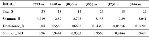De acuerdo con el índice de Shanon-Wiener el transecto en el rango altitudinal con mayor uniformidad en la distribución de las especies es el de 2771 m (con un valor de 3,219), seguido por 3055 m (3,135) y 3244 m (3,041); el rango altitudinal que presentó menor uniformidad fue 3030 m (con 2,708). En cuanto a la dominancia, el valor más alto es 3030 m (0,06667), lo que indica que es el transecto con menor diversidad, seguido por 2880 y 3232 m (0,05556 cada uno). El índice de diversidad refleja que el rango altitudinal 2771 m, que presenta mayor diversidad (con un valor de 0.96), seguido por 3055 y 3244 m (con valores de 0,9565 y 0,9479 respectivamente) (tabla 1).