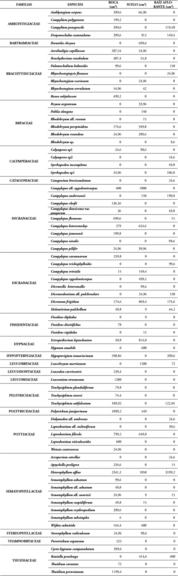 Raíz aflorante de roble: se realizaron 25 levantamientos, donde se hallaron 28 especies en 22 géneros y 13 familias. La familia más diversa fue Leucobryaceae con 25 % (7 especies), seguida por Sematophyllaceae con 14,2 % (4), Calymperaceae y Dicranaceae con 10,7 % (3), Amblystegiaceae y Pottiaceae con 7,14 % (2 especies cada una), mientras que, las familias restantes Catagoniaceae, Hypopterygiaceae, Brachytheciaceae, Thuidiaceae, Bryaceae, Leucomiaceae y Pilotrichaceae constituyeron solo el 3,57 % (una especie cada una).