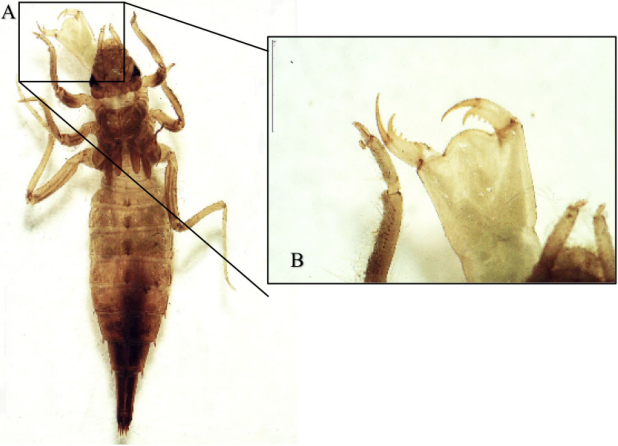Figura 2 Ninfa de Peruviogomphus sp. A. Vista general en posición dorsal. B. Detalle del labio y prementón.