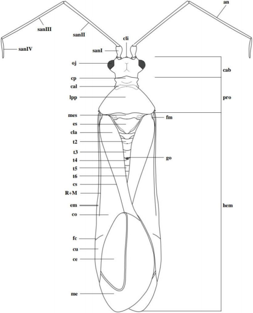 Figura 1 Anatomía general externa de Monalonion, vista dorsal. Abreviaturas: antena (an), cabeza (cab), callo (cal), celda (ce), clavo (cla), clípeo (cli), collar pronotal (cp), corio (co), cúneo (cu), embolio (em), escutelo (es), fractura costal (fc), fractura medial (fm), glándula odorífera (go), hemiélitro (hem), lóbulo posterior del pronoto (lpp), membrana (me), mesoescuto (mes), ojo (oj), pronoto (pro), vena Radial+Medial (R+M), terguito 2-6 (t-), segmentos antenales I-IV (san-), sutura claval (sc)