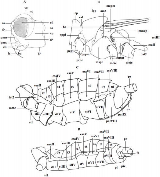 Figura 2 Entidades anatómicas externas de los tagmas de Monalonion, vista lateral. A. Cabeza, B. Tórax, C. Abdomen hembra, D. Abdomen macho. Abreviaturas: apodema mesoepisternal (ame), basalar (ba), búcula (bu), callo (cal), clípeo (cli), collar pronotal (cp), espiráculo abdominal II-VIII (esa-), espiráculo torácico III (estIII), esternito I-VII (st-), faloteca (fa), frente (fr), gena (ge), gula (gu), labro (la), lateroterguito 2 (lat2), lóbulo medial del metaepimero (lmmep), lóbulo posterior del pronoto (lpp), mesocoxa (mesc), mesoepimero (mepm), metacoxa (metc), mesoepisterno (mspt), metaepisterno (mtpt), ojo (oj), ovipositor (ov), paramero izquierdo (piz), paraterguito VIII-IX (pat-), pigóforo (pi), placa mandibular (pmn), placa maxilar (pmx), procoxa (proc), proctiger (pr), proepimero (pepm), proepisterno (pept), región posocular (rp), sutura antenal (sa), sutura coronal (sc), sutura ocular (so), sutura propleural (sppl), terguito 2-8 (t-), vértice (ve)