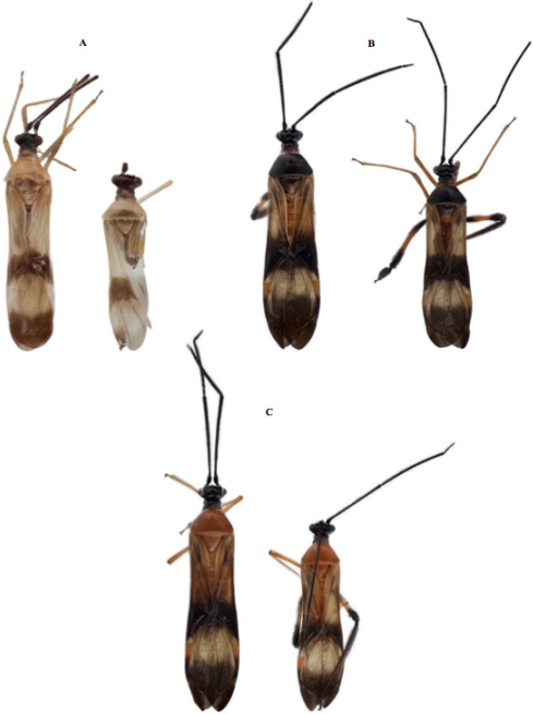 A partir de la variación de colores, Carvalho (1954, 1957, 1972) propuso lo siguiente: M. bothrocranum, M. braconoides, M. ichneumonoides, M. illustris y M. reuteri se declararon sinonimias de M. annulipes. Igualmente, en una revisión basada en la similitud existente en el patrón de coloración, M. collaris y M. megiston fueron declaradas sinonimias de M. dissimulatum (figura 4), con las siguientes afirmaciones: 1) “Monalonion collarisDistant, 1917: el Tipo revisado, probablemente una hembra, es idéntica con Monalonion dissimulatum Distant, 1883” (Carvalho, 1954); 2) Monalonion megistonKirkaldy, 1902 “coloración idéntica a la de Monalonion dissimulatum Distant, 1883, diferenciándose de la misma apenas por tener el collar un poco más elevado y con la región apical rojiza” (Carvalho, 1972).