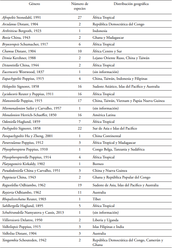 La distribución geográfica se concentra principalmente en el reporte de las localidades tipo, correspondientes a Brasil, Colombia, Costa Rica, Guatemala, Panamá, Perú y México (Schuh, 2002-2013), y los registros de altitud se incluyen solo para tres especies (Carvalho, 1972).