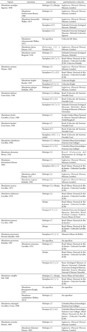 Tabla 2 Especies, sinonimias e instituciones depositarias de los especímenes tipo de las especies del género Monalonion.