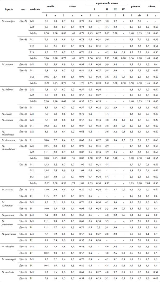 A través de la historia de las descripciones y redescripciones de las especies, se constata el uso repetitivo de caracteres morfométricos, así, cuerpo: largo y ancho; cabeza: largo, ancho y ancho del vértice; segmentos antenales: largo; collar pronotal: largo y ancho; cúneo: largo y ancho (Carvalho, 1972, 1984, 1985a; Carvalho y Costa, 1988). En la tabla 3 se presentan las medidas de estructuras morfológicas exploradas por varios investigadores para machos y hembras de las especies del género Monalonion (Monte, 1942; Carvalho, 1951, 1972, 1984, 1985a; Carvalho y Costa, 1988).