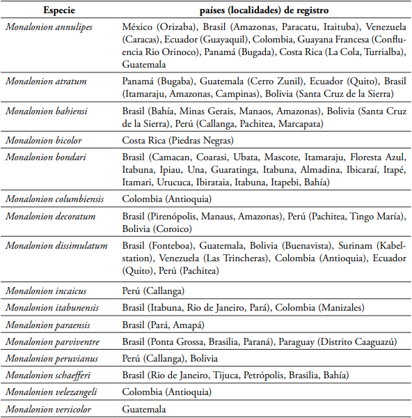 Los datos de distribución geográfica de las especies reconocidas para el género Monalonion son limitados. El número de especies registradas por cada país incluye 10 para Brasil; cinco para Colombia, Perú y Bolivia; cuatro para Guatemala; tres para Ecuador; dos para Panamá, Costa Rica y Venezuela; y una para México, Guayana Francesa, Surinam y Paraguay (Herrich-Schaeffer, 1850; Signoret, 1858; Stål, 1858; Distant, 1883; Kirkaldy, 1907; Costa Lima, 1938; Monte, 1942; Carvalho, 1972, 1984, 1985a, b; Carvalho y Costa, 1988). Por otro lado, los especímenes de Monalonion depositados en varias colecciones entomológicas se limitan en su mayoría al registro del país, provincia, departamento o municipio. Estos datos resultan insuficientes para los estudios de distribución geográfica y biogeografía del género (obs. pers.). De acuerdo con lo anterior, con el propósito de ampliar el conocimiento de la distribución geográfica de cada especie en la región Neotropical se deben adelantar búsquedas de especímenes de Monalonion en áreas geográficas sin explorar.