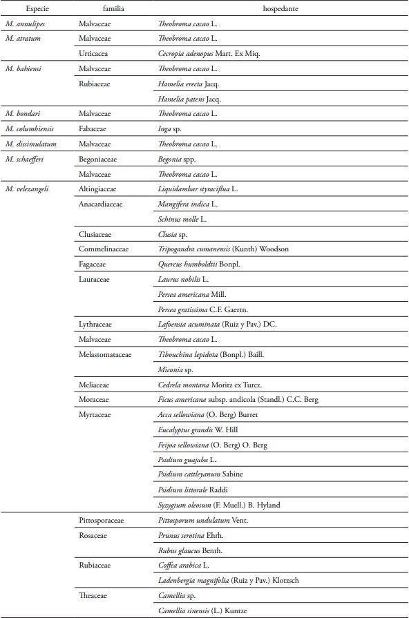 Las plantas hospedantes se indican solo para ocho de las 16 especies (Distant, 1883; Distant, 1917; Bondar, 1939; Carvalho, 1957, 1972, 1984; Carvalho y Ferreira, 1972; Carvalho y Costa, 1988; Maes y Tellez, 1988; Franco y Giraldo, 1999; Piart, 1977; Ramírez et al., 2007; Ramírez, Gil, Benavides y Bustillo, 2008; Londoño Z., 2014; Rodas et al., 2014; Ocampo et al., 2018).