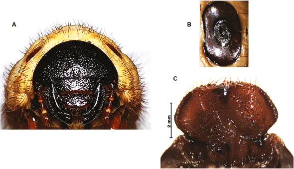 Cabeza. Ancho máxima de la cápsula cefálica de 19-20 mm (Figura 7A), superficie negra, gruesamente punturada, punturas profundas separadas por aproximadamente un diámetro, a veces coalescentes; frente densamente punturada, punturas basales un poco más pequeñas, disco o parte posterior con punturación más densa y gruesa, a veces coalescente, a cada lado con cuatro setas frontales posteriores, con 70-80 setas frontales anteriores, dos-tres setas frontales exteriores, seis-siete setas en el ángulo frontal, cuatro-cinco setas dorso-epicraneales, entre 40-50 setas cortas epicraneales, cinco a ocho setas paraocelares; clípeo trapezoidal, con dos setas largas a cada lado, cuatro a seis setas basales, punturado grueso e irregular, disco rugoso, suavemente chagrinado; labro ligeramente asimétrico, con los lados redondeados, chagrinado, con seis a ocho setas a cada lado; disco irregularmente punturado, punturas notables más grandes, con el doble de diámetro que las otras; en la mitad posterior punturado más grueso y separado por uno o más diámetros.