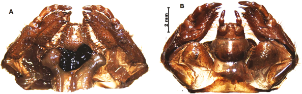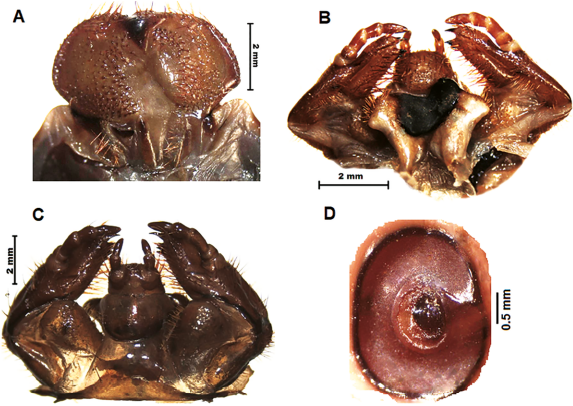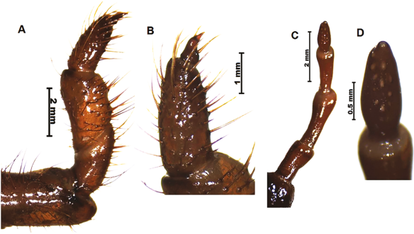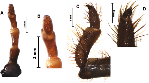 Patas. Grandes, en ubicación ventral (Figura 18C); protibias con tres dientes en el borde anterior, el primero en la porción media y los otros se disponen contiguos al ápice; mesotibias con dos dientes pequeños en el borde externo y otros cuatro apicalmente; metatibia similar a la mesotibia; tarsomeros delineados, de similar longitud los tres (22-23 mm).