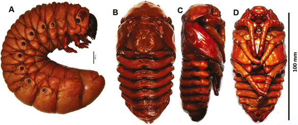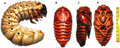 Figura 11 M. elephas: A. larva de tercer instar, vista lateral; B, C, y D pupa: B. frontal; C. lateral; D. ventral.
