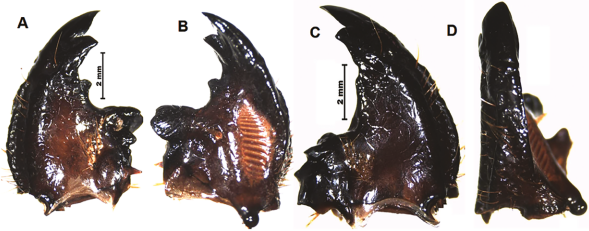 Figura 2 M. actaeon: mandíbulas, A. mandíbula izquierda dorsal; B. mandíbula izquierda ventral; C. mandíbula derecha dorsal; D. mandíbula derecha lateral.