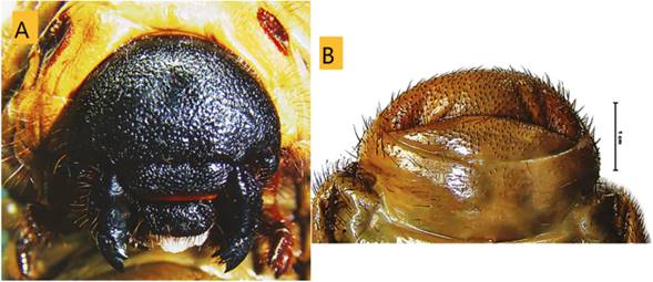 Labro. Ligeramente asimétrico, punturado más regular, una seta a cada lado del disco, entre tres a cuatro setas laterales a cada lado y 18-20 setas en el borde posterior, borde anterior multisetoso, con disco rugoso y punturado, región posterior densamente punturada, punturas pequeñas (Figura 17A).