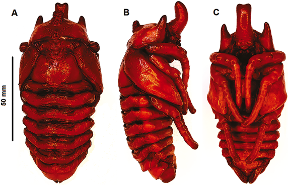 Cabeza. Transversa, ubicada ventralmente, con antenas, ápices mandibulares, palpos y demás piezas bucales visibles y delineados; antenas apicalmente ensanchadas y suavemente anilladas; ojos hundidos, parcialmente visibles; región frontoclipeal dotada de un gran cuerno, el cual está dirigido hacia adelante y en el tercio distal se curva perpendicularmente a su plano hacía arriba, terminando en un ápice orquillado; región media dorsal del cuerno presenta un abultamiento; clipeo transverso, abultado, redondeado y ligeramente ensanchado a sus extremos (Figuras 12B, 12C).