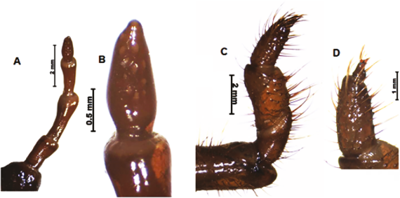 Figura 4 M. actaeon: A. Antena; B. último segmento antenal; C. Primer par de patas, D. tarsungulo, mostrando la uña y las setas.