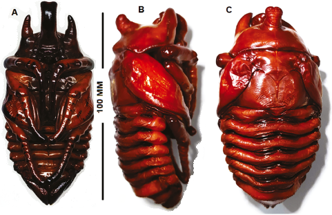 Longitud (vista dorsalmente): 13,2 - 13,5 cm, ancho máximo del tórax, visto dorsalmente: 35-36 mm, ancho máximo del abdomen (visto dorsalmente): 42-44 mm (Tabla 2).