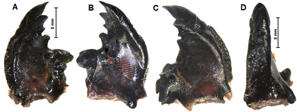 Mandíbula izquierda. Con área incisiva aguda (S1 y S2) una muesca estrecha que separa al incisivo tres que es obtuso, un área curvada separa al incisivo cuatro que es obtuso, seguido de un área media inerme, contigua del área molar, cuya primer corona es prominente y las otras dos son fundidas y bajas (Figuras 14A, 14B). Mandíbula derecha: con primer incisivo triangular proyectado, sigue una muesca angosta el incisivo tres de ápice agudo y después una cuarta muesca para un incisivo redondeado corto, un área inerme y después sigue un área molar con la primera corona corta y la segunda corona larga y proyectada, las mandíbulas tienen el scrobis ensanchado con varias setas (Figuras 14C, 14D).