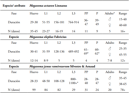 Tabla 1 Datos de los ciclos de vida de Megasoma actaeon L, M. elephas F y M. janus ramirezorum Silvestre & Arnaud; la duración se presenta en días (abreviaturas: L1: larva I, primer estado; L2: larva II, segundo estado; L3: larva III, tercer estado; PP prepupa; P: pupa; N: cantidad de observaciones; +: la cifra podría ser mayor; adulto obtenido en cría y/o parental; +*ver texto para más explicaciones).