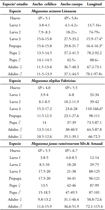 Tabla 2 Medidas corporales (mm) de los estadios de desarrollo y adultos parentales de la cría de Megasoma actaeon L, M. elephas F y M. janus ramirezorum Silvestre & Arnaud (abreviaturas: Ø1 huevo recién puesto; Ø2 huevo elongado; L1: larva I, primer estado; L2: larva II, segundo estado; L3: larva III, tercer estado; PP prepupa; P: pupa; Adulto* obtenido en cría y/o parental; N: cantidad de observaciones; +: la cifra podría ser mayor; * ver comentarios para más explicaciones).