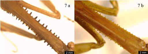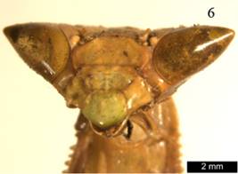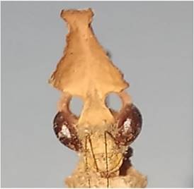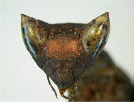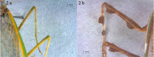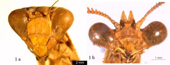 1’ Tubérculos ocelares laterales prolongados en dos procesos agudos cónicos o foliáceos (Figura 1b). Tibias medias y posteriores generalmente con pequeños lóbulos (Figura 2b) ........ Vatini