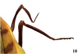 Nota: El ejemplar examinado tiene entre otras distinciones, la primera y tercera espina discoidal de los fémures anteriores negruzcas características de esta especie descrita de Ecuador, por lo que con estos reportes constituye un nuevo registro para la fauna colombiana [NR].