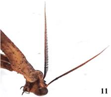2’ Tubérculos ocelares prolongados en procesos muy cortos, fémures y tibias sin lóbulos, algo arqueados y aplanados (Figura 10). Antenas del macho pectinadas (Figura 11), pronoto esbelto, granulado con bandas transversales presentes en los tergitos abdominales ........ Pseudovates