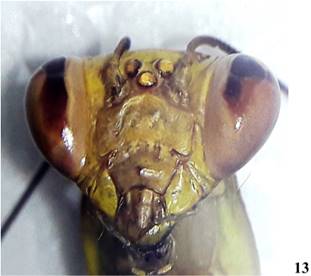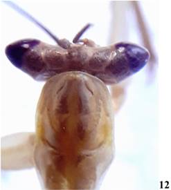 1’ Rostro con el escudo frontal tan ancho como largo. Pronoto algo robusto, márgenes de la prozona no paralelos (Figura 12). Cercos menos del doble de largo que la placa supranal. Cercomeros distales cilíndricos ........ Photina